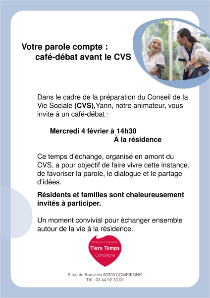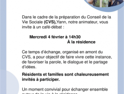Dans le cadre de la préparation du Conseil de la Vie Sociale, Yann, notre animateur, organisera un café-débat le Mercredi 4 février à 14h30.
