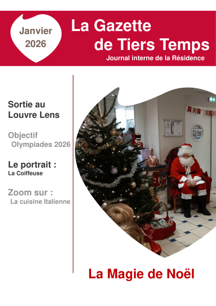 Résidence Tiers Temps > Actualités > La Gazette de Tiers Temps La Gazette de Tiers Temps Publiée le 20/01/2026 La Gazette de Janvier est à présent disponible sur votre kiosque d'information sur Family Vi ou directement à l'accueil de la résidence. Bonne lecture
